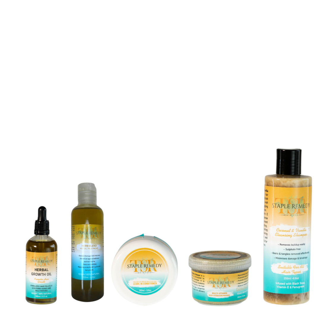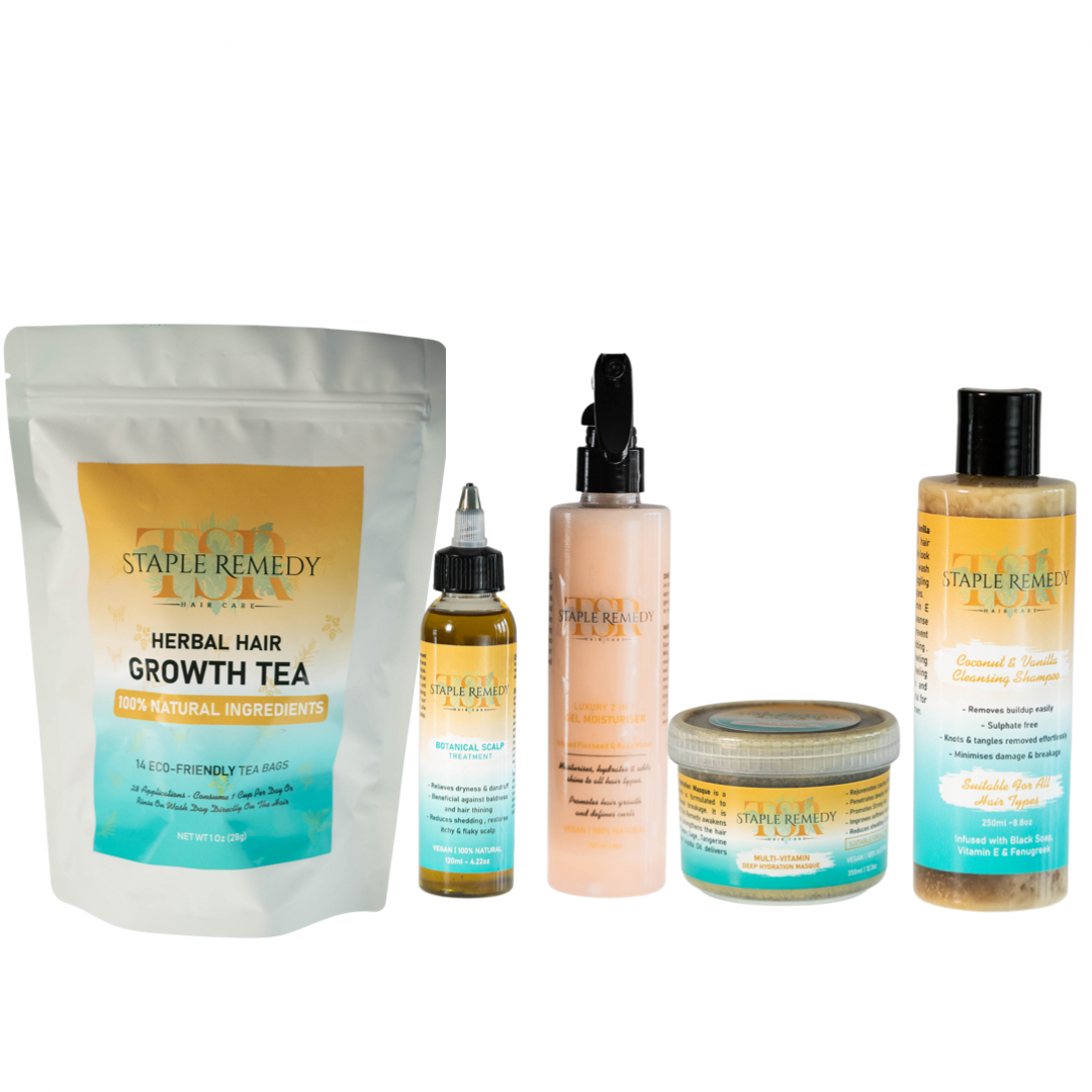 For damage repair treatment , this bundle has been formulated to assist daily & on wah days . Whether you have a protective style or your natural. hair styles daily. Our luxury 2 in 1 gel moisturiser is a water based with key ingredients of aloe vera & flaxseed. To assist we have our herbal hair growth tea, botanical scalp renewal oil, multi-vitamin deep treatment masque and shampoo.